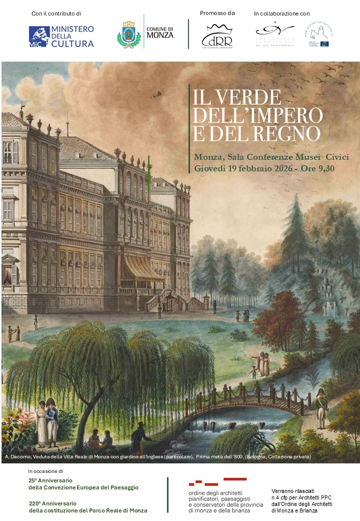 Il convegno “Il Verde dell’Impero e del Regno. Giardini, Natura e Scienza in epoca napoleonica” è promosso dal Centro documentazione Residenze Reali lombarde in occasione del 25° anniversario della Convezione europea sul paesaggio e del 220° anniversario della costituzione del Parco reale di Monza. Dedicato al tema del paesaggio e dei giardini in Europa e nell’Italia napoleonica è realizzato in collaborazione con la Federazione Europea delle città napoleoniche e con il contributo del Ministero per i Beni Culturali e dell’Assessorato al Turismo e Marketing territoriale del Comune di Monza.