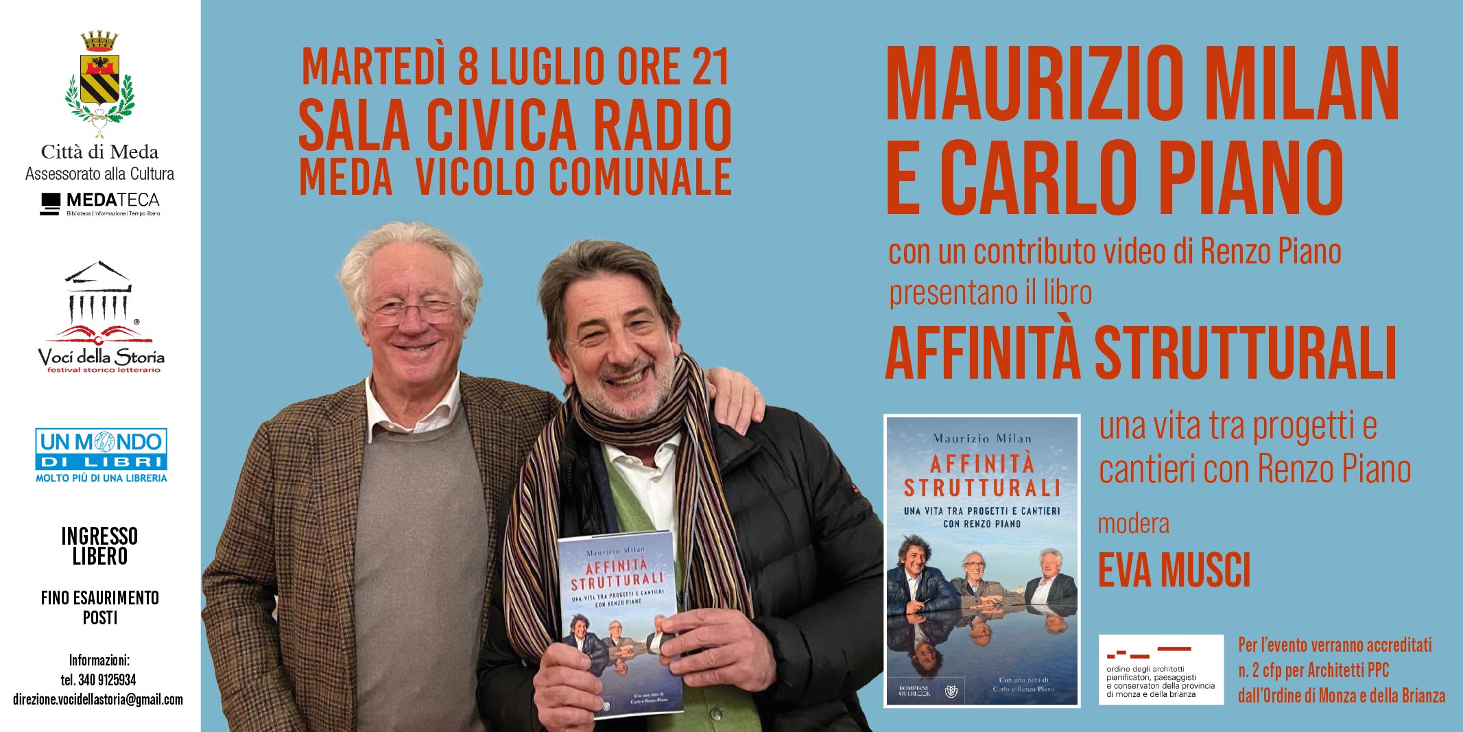 La Proloco di Meda, con il patrocinio della Città di Meda e, con il rilascio dei cfp da parte dell'Ordine degli Architetti PPC della provincia di Monza e della Brianza, è lieta di invitare gli interessati alla presentazione del libro "AFFINITA' STRUTTURALI. Una vita tra progetti e cantieri con Renzo Piano".