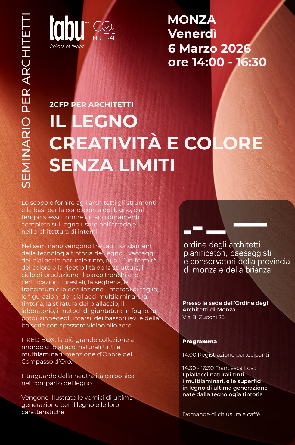 Nel seminario vengono trattati i fondamenti della tecnologia tintoria del legno, i vantaggi del piallaccio naturale tinto, quali l'uniformità del colore e la ripetibilità della struttura, il ciclo di produzione: il parco tronchi e le certificazioni forestali, la segheria, la tranciatura e la derulazione, i metodi di taglio, le figurazioni dei piallacci multilaminari, la tintoria, la stiratura del piallaccio, il laboratorio, i metodi di giuntatura in foglio, la produzione degli intarsi, dei bassorilievi e della boiserie con spessore vicino allo zero.