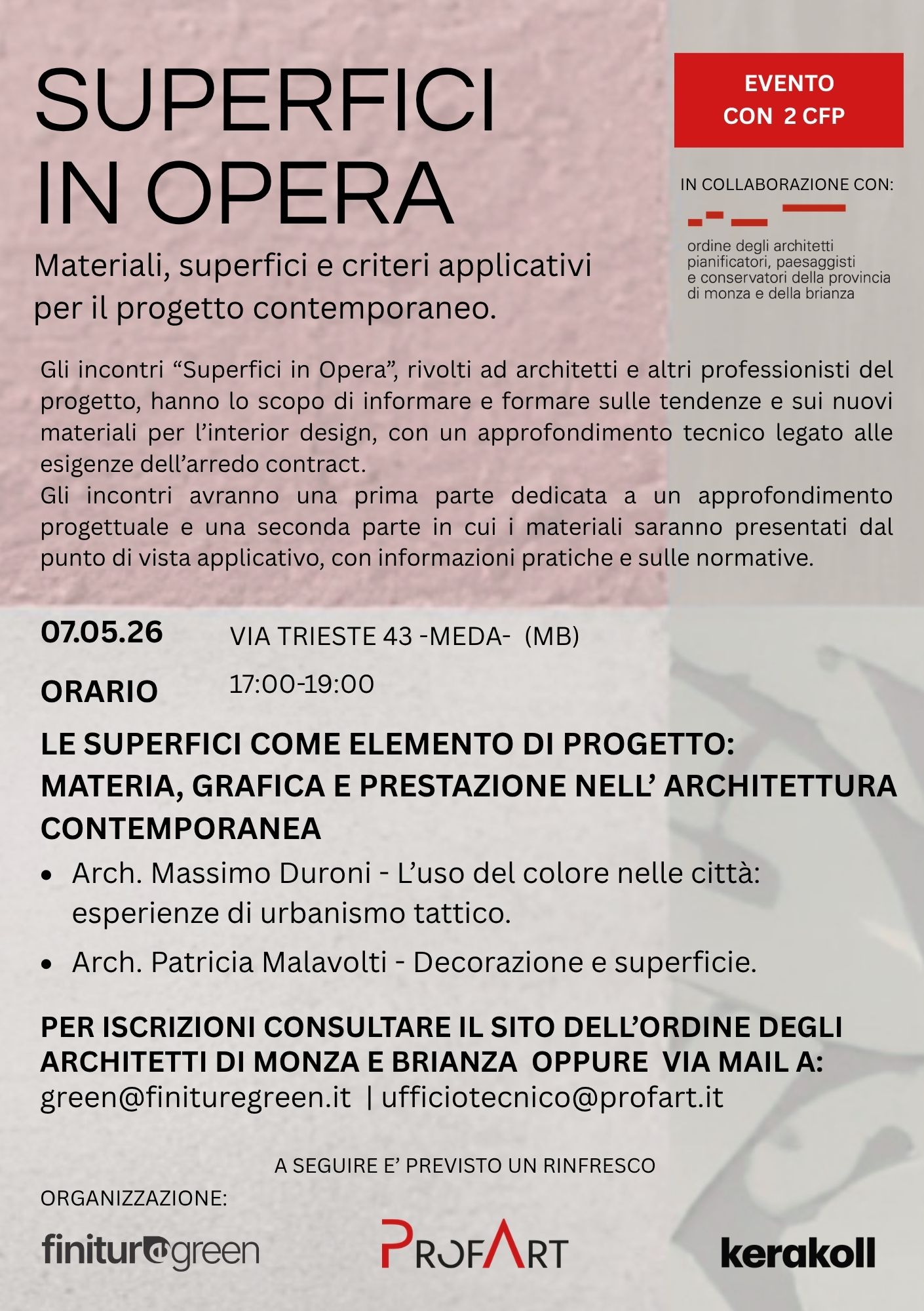 Gli incontri Superfici in Opera rivolti ad architetti e altri professionisti del progetto hanno lo scopo di informare e formare sulle tendenze e sui nuovi materiali per l’interior design con un approfondimento tecnico legato alle esigenze dell’arredo contract. Gli incontri avranno una prima parte dedicata ad un approfondimento progettuale e una seconda parte dove i materiali saranno presentati dal punto di vista applicativo, con informazioni pratiche e sulle normative.