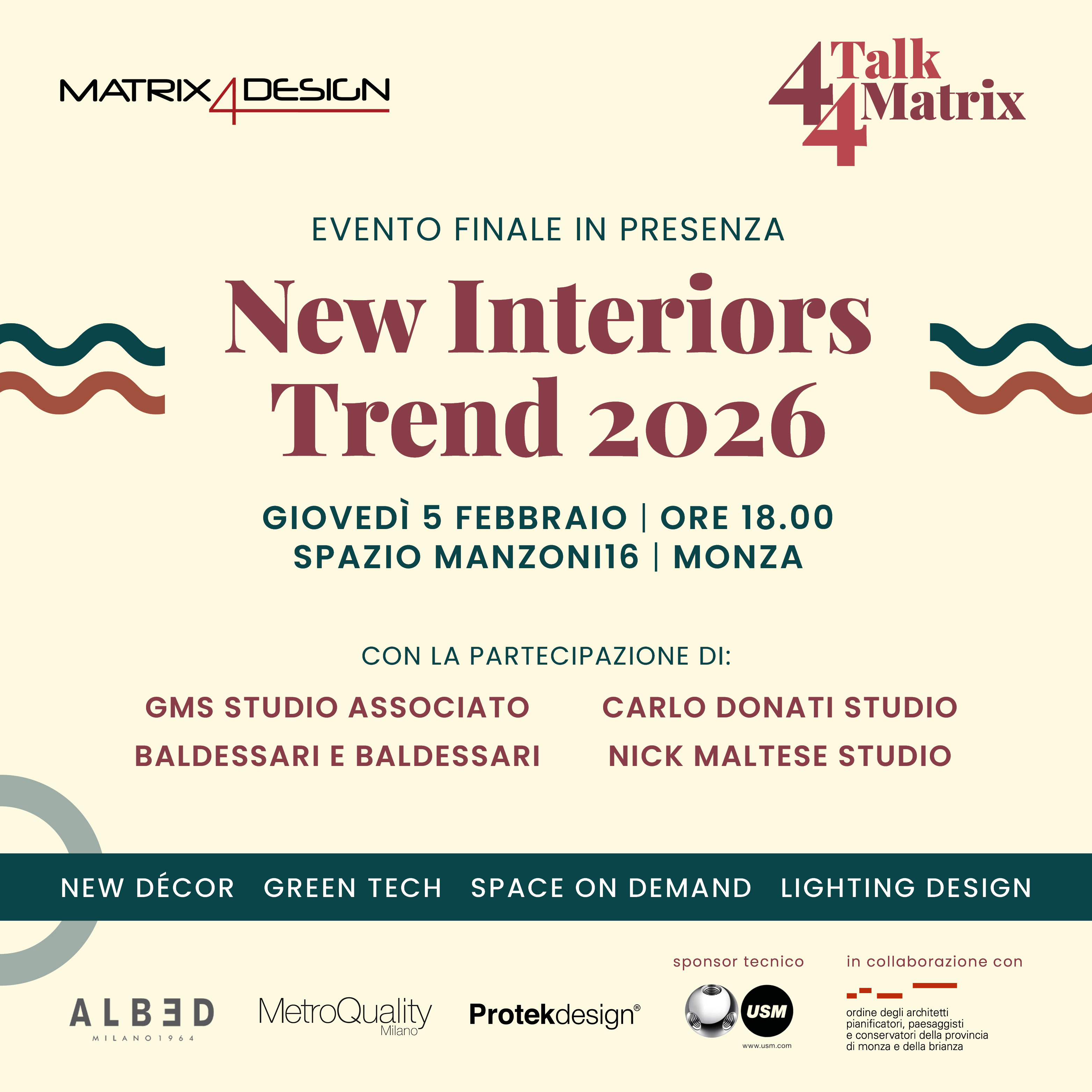 Matrix4Design, il magazine digitale B2B, punto di riferimento per il mondo dell’architettura e del design e hub di relazioni privilegiato con i professionisti del progetto, con la collaborazione dell'Ordine degli Architetti PPC della provincia di Monza e della Brianza, giovedì 5 febbraio conclude il format 4Talk4Matrix. I nuovi trend dell’interior design con un esclusivo evento dal vivo moderato da Alessandra Coppa.