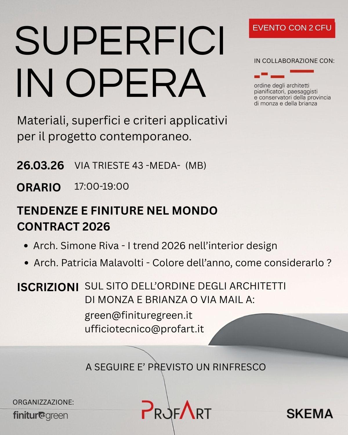 Gli incontri Superfici in Opera rivolti ad architetti e altri professionisti del progetto hanno lo scopo di informare e formare sulle tendenze e sui nuovi materiali per l’interior design con un approfondimento tecnico legato alle esigenze dell’arredo contract. Gli incontri avranno una prima parte dedicata ad un approfondimento progettuale e una seconda parte dove i materiali saranno presentati dal punto di vista applicativo, con informazioni pratiche e sulle normative.